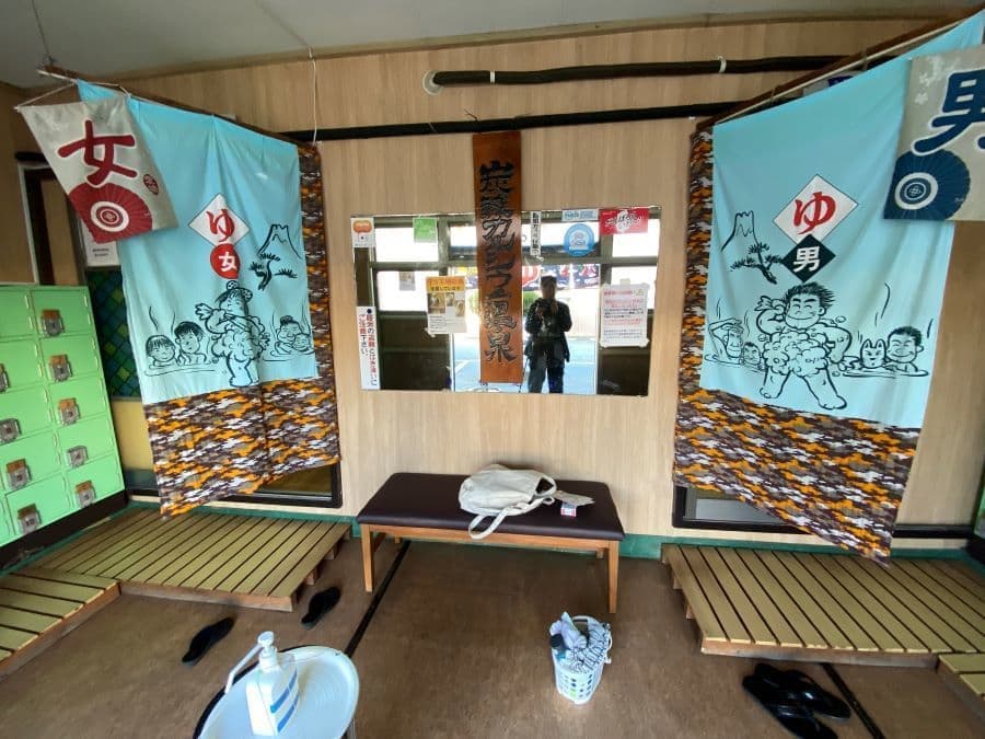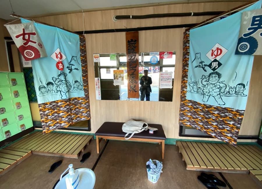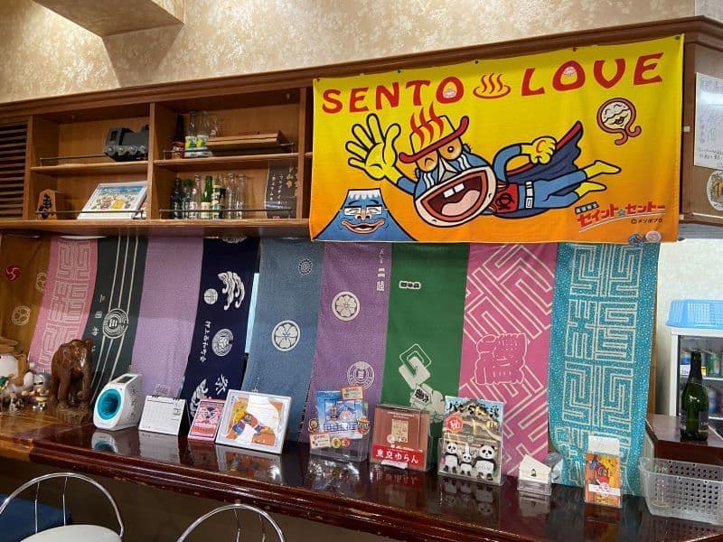 入り口の暖簾も変わっていました。そして番台を抜け脱衣室から見渡す新作とは、、、なんと暖簾の富士山とJAPAN SODAに。