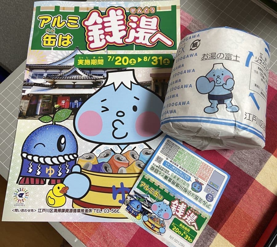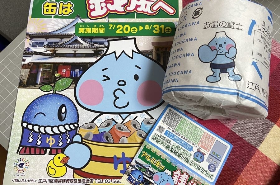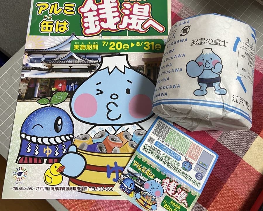 江戸川区浴場組合は時折面白い企画を実施してくれますが、今回は区の環境部清掃課とコラボしたアルミ缶の回収です。