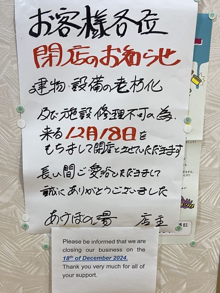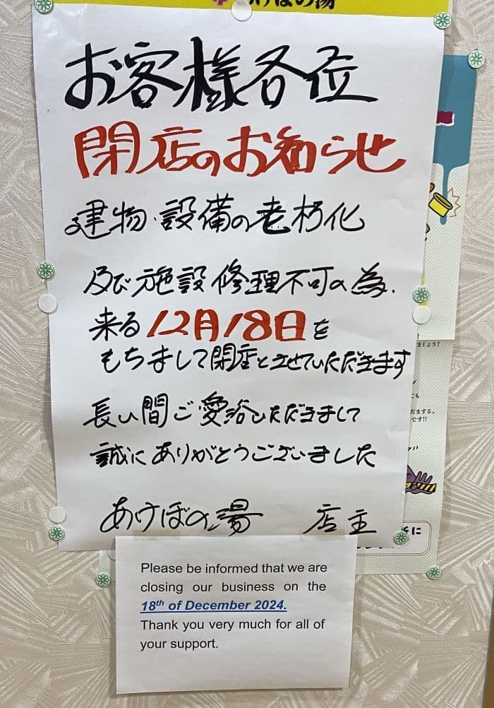 船堀に住んでいた頃に良く通った「あけぼの湯」さんですが、この12月18日を持って廃業となります。