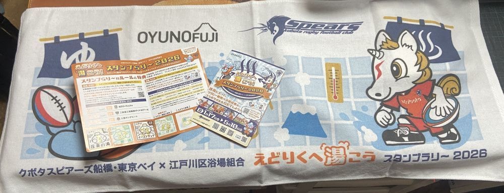 そしてその招待券でホストゲームを観戦すると、江戸川銭湯のマスコットキャラクター「お湯の富士」とクボタスピアーズ船橋・東京ベイのマスコットキャラクター「スッピー」のコラボタオルもプレゼントもらえました。